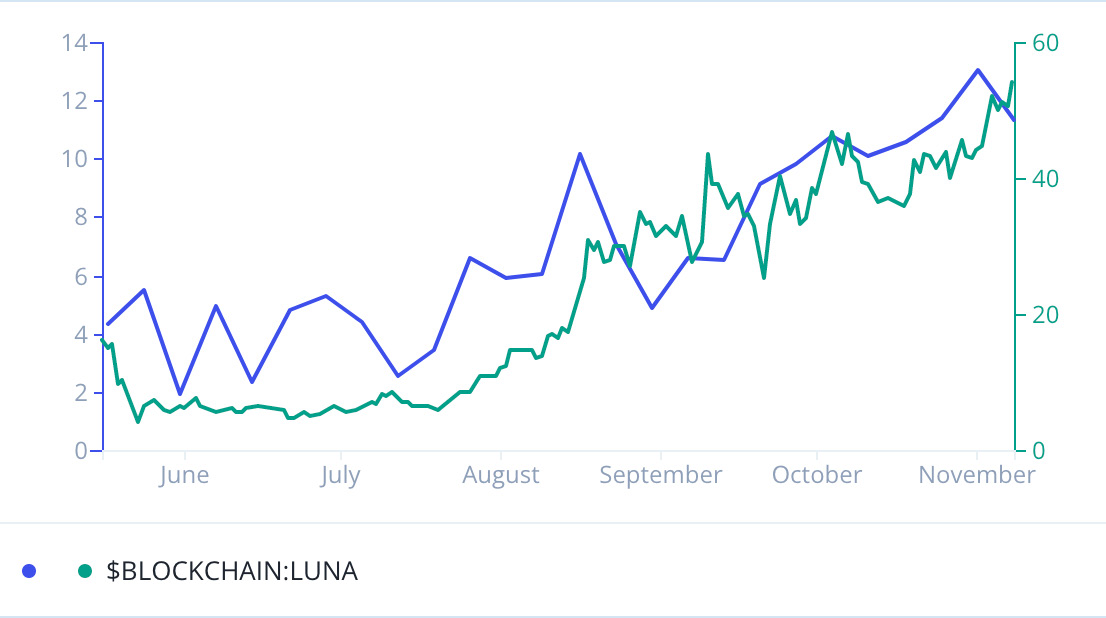 Track the number of commits on Github for 1800+ cryptocurrencies as a proxy for token takeup.