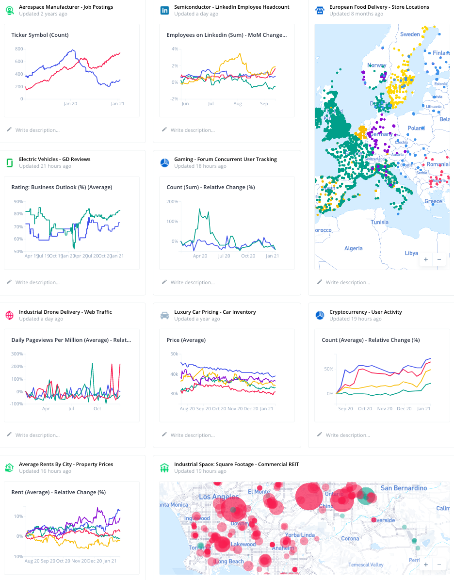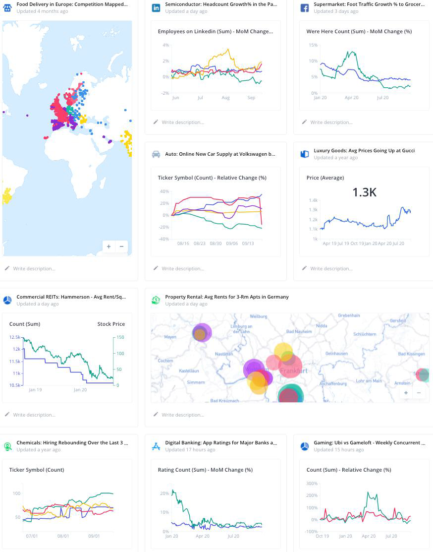 As economic activity comes online, new data trails are left behind. The most innovative investors leverage this data for alpha-generating insights. Thinknum’s alternative datasets power investment decisions across companies listed in all major European exchanges.