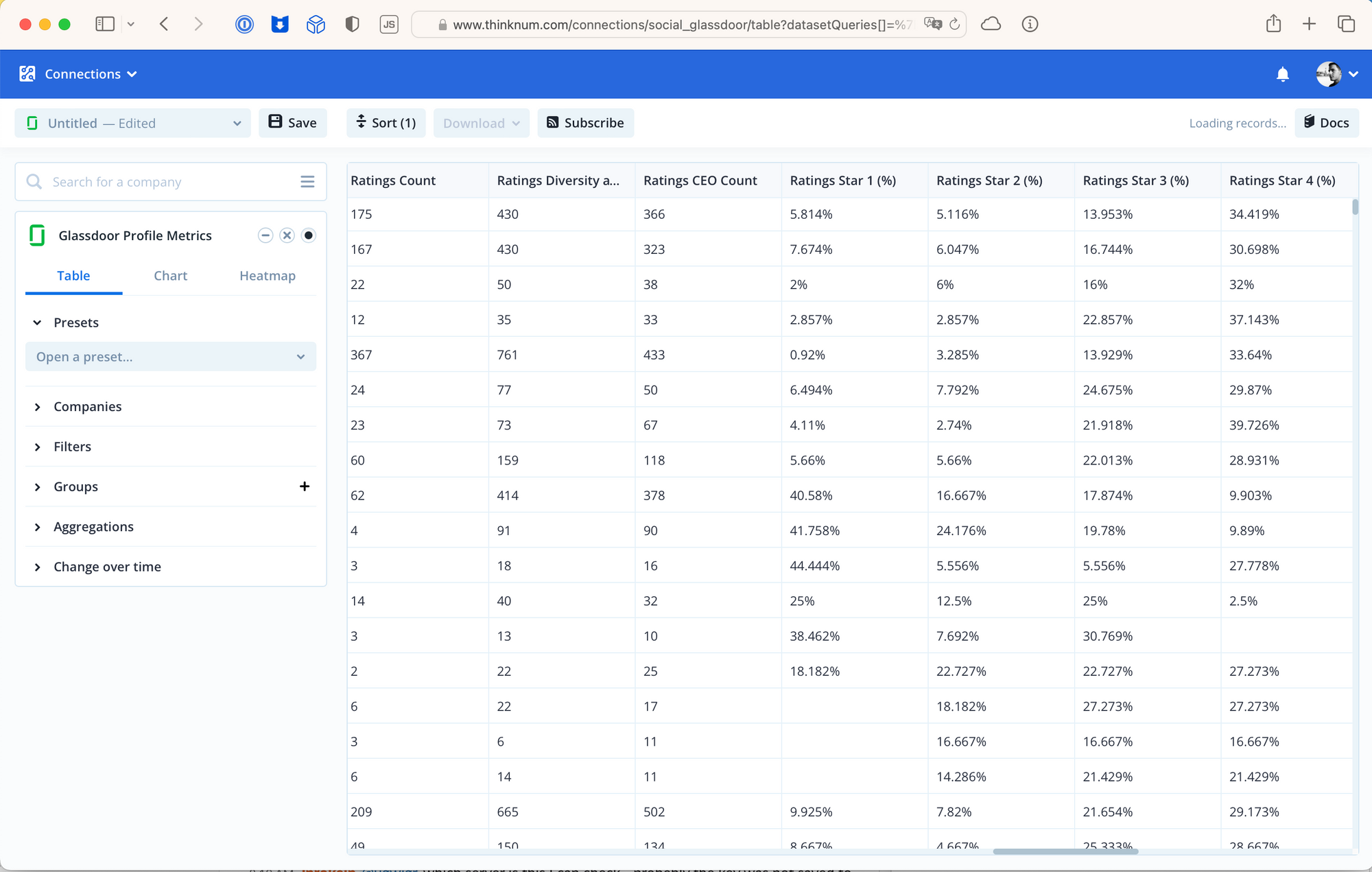 - CEO Ratings - Reviews Count: track sample size for our popular CEO Ratings data, in order to ensure ratings aren't skewed by a small number of reviewers.