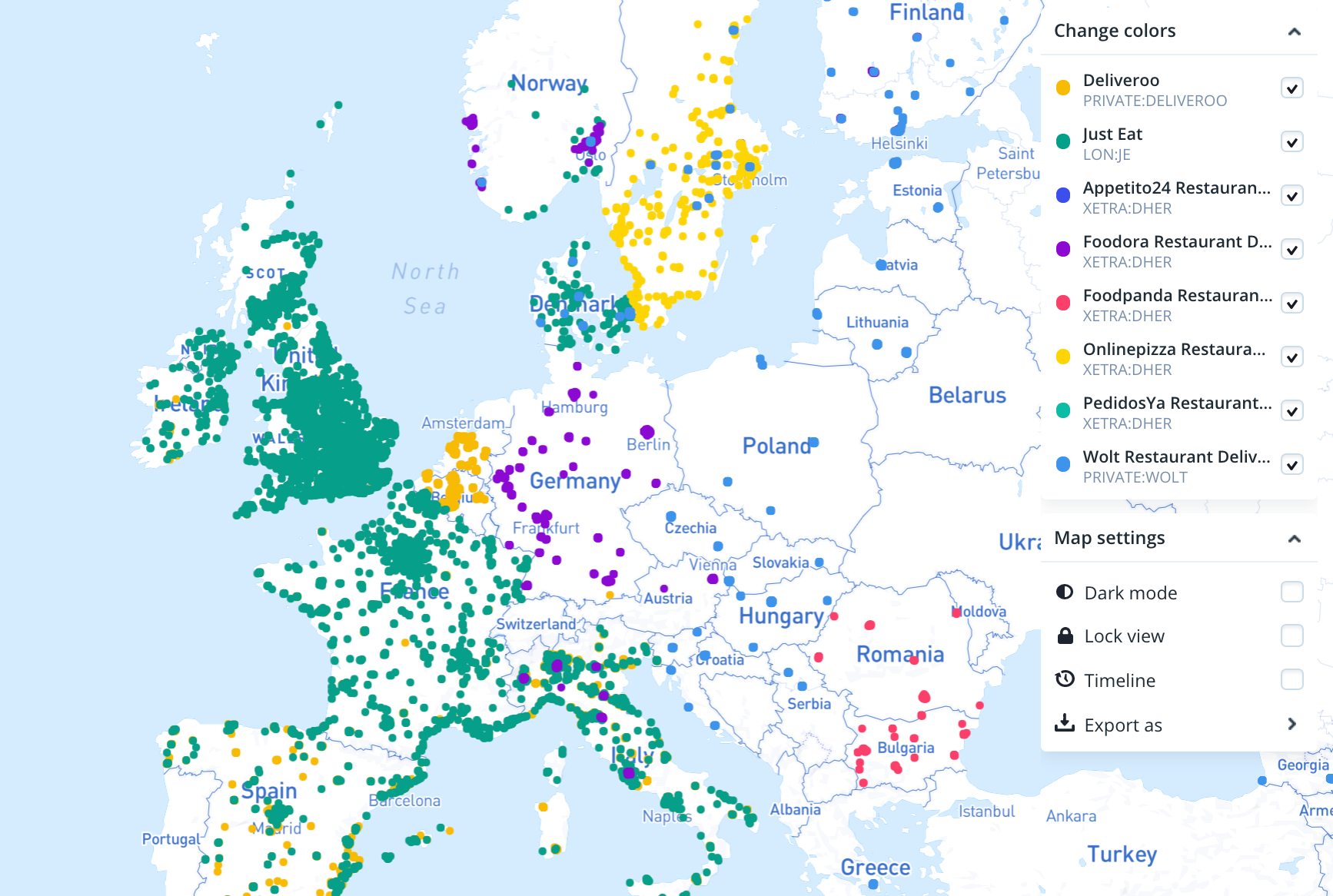 Our Store Locations dataset allows users to compare bricks-and-mortar locations across companies in a user-friendly map - a powerful tool for lead generation, competitive intelligence, and more. As the food delivery wars heat up across Europe, for example, map the restaurants that partner with each player to understand where competitors are fighting for market dominance.