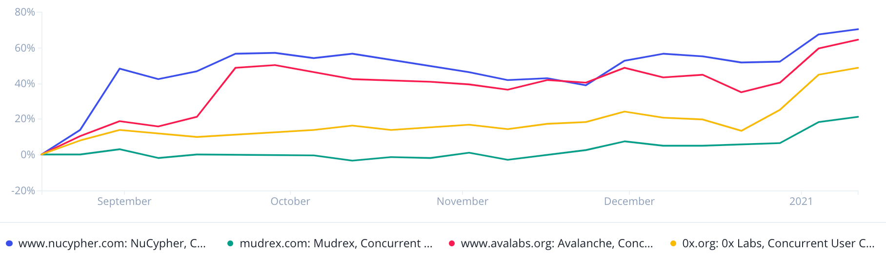 Our Traction dataset tracks the number of active forum users on different cryptocurrency trading platforms. This is a real-time indicator of how different platforms change in popularity over time.