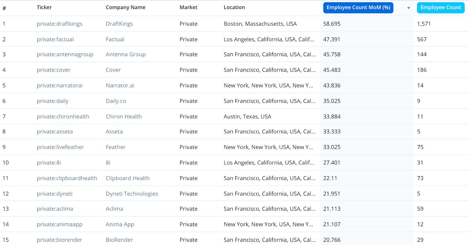 Identify the fastest growing companies according to headcount. Filter by industry, location and company size.
