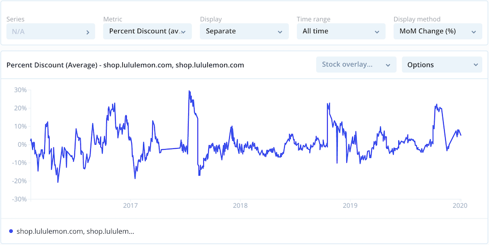You can now access MoM changes in charts in addition to YoY, QoQ and WoW previously. For example, track the average discount of LULU products on a MoM basis as a proxy for their holiday season sales.