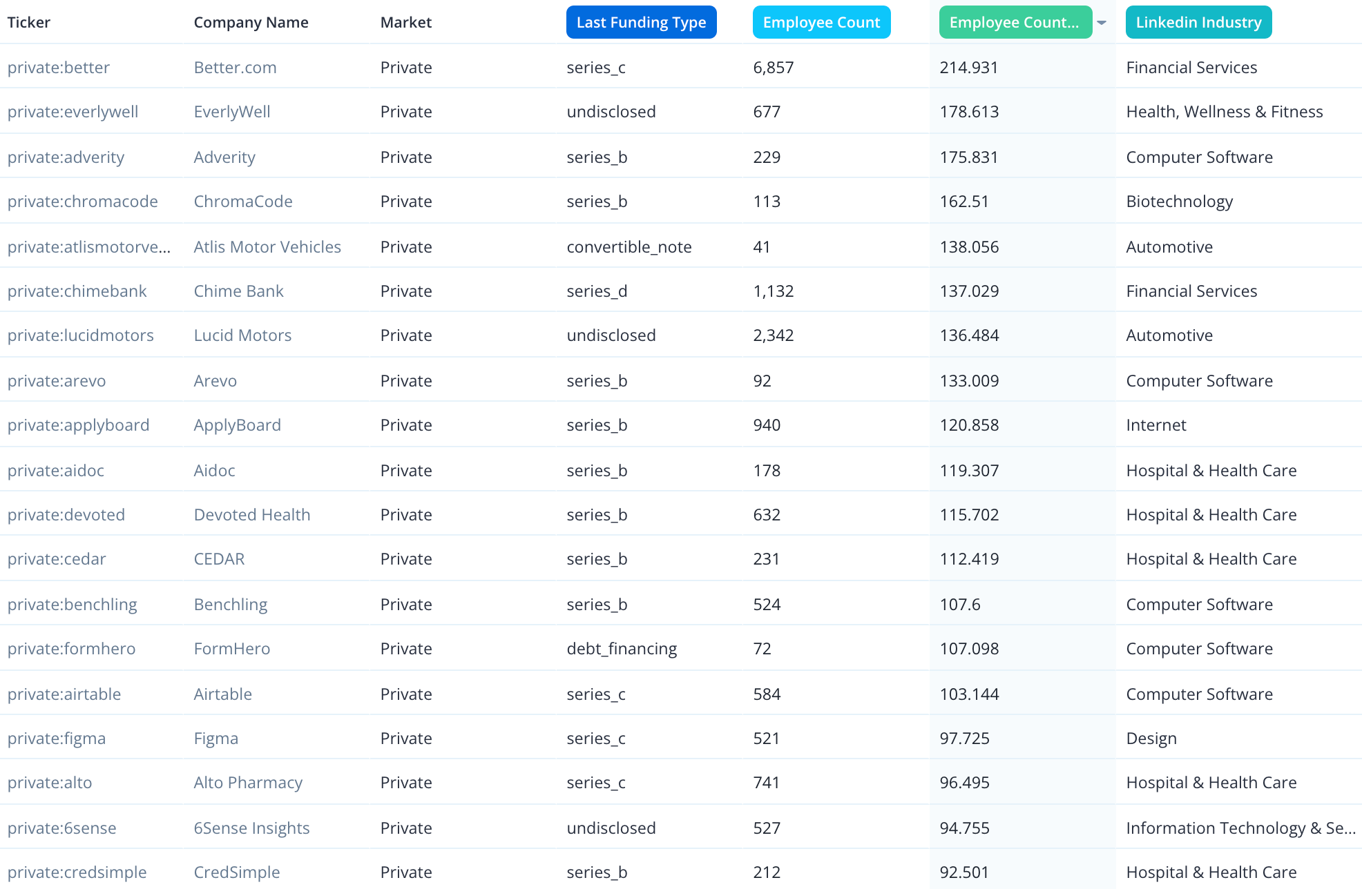 Use Thinknum’s ‘Screener’ feature to combine multiple data sources and identify fast growing companies. Our user-friendly UI lets you compare metrics including: