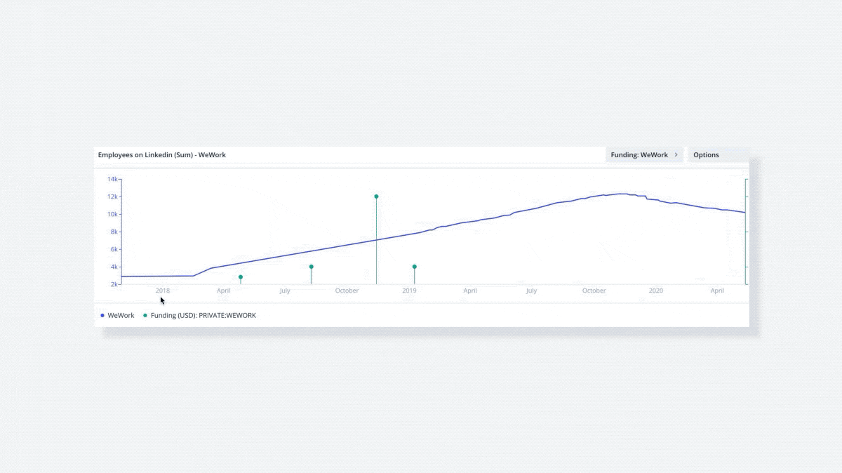 Analyze funding rounds alongside any of Thinknum’s datasets to overlay the effects of financing on a company. For example, track the changes in WeWork headcount relative to their funding over time.