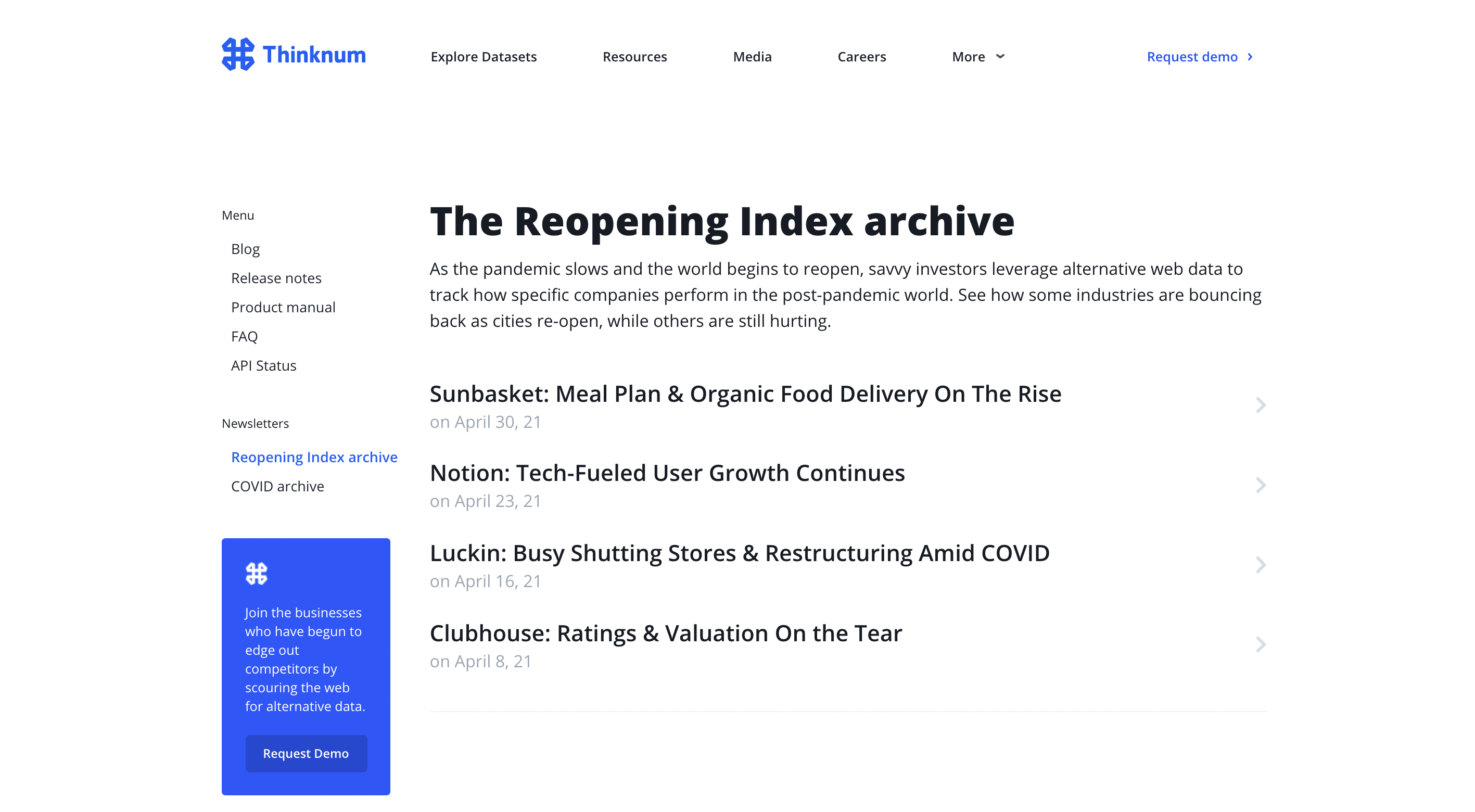 Gain unprecedented access to The Reopening Index, one of our most popular public dashboards, without a Thinknum account. Every week, six hand-picked insights detail how some industries are bouncing back as cities re-open, while others are still hurting from the pandemic.