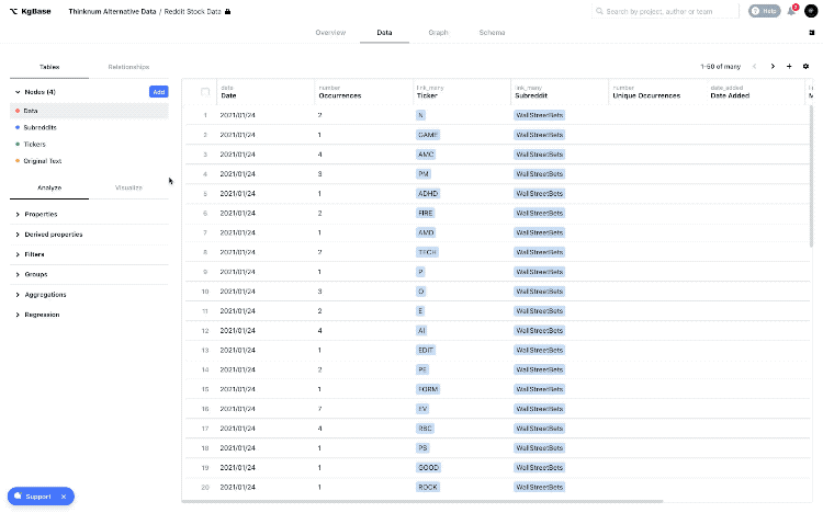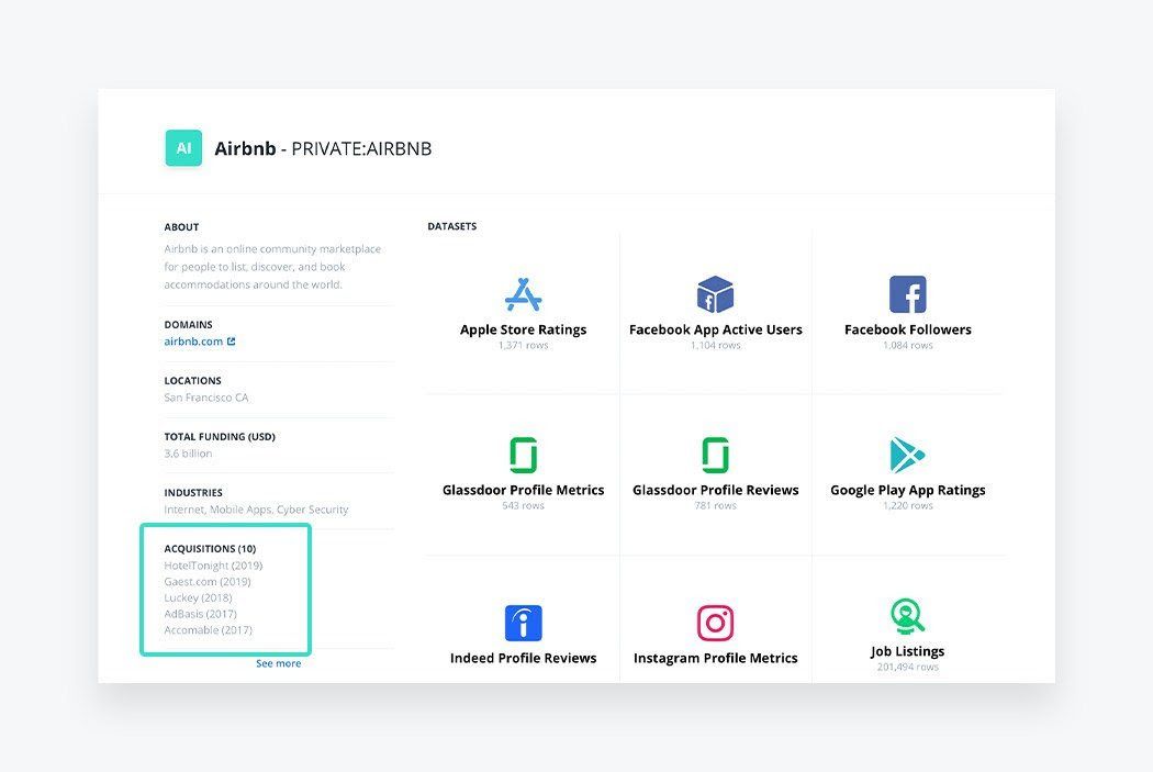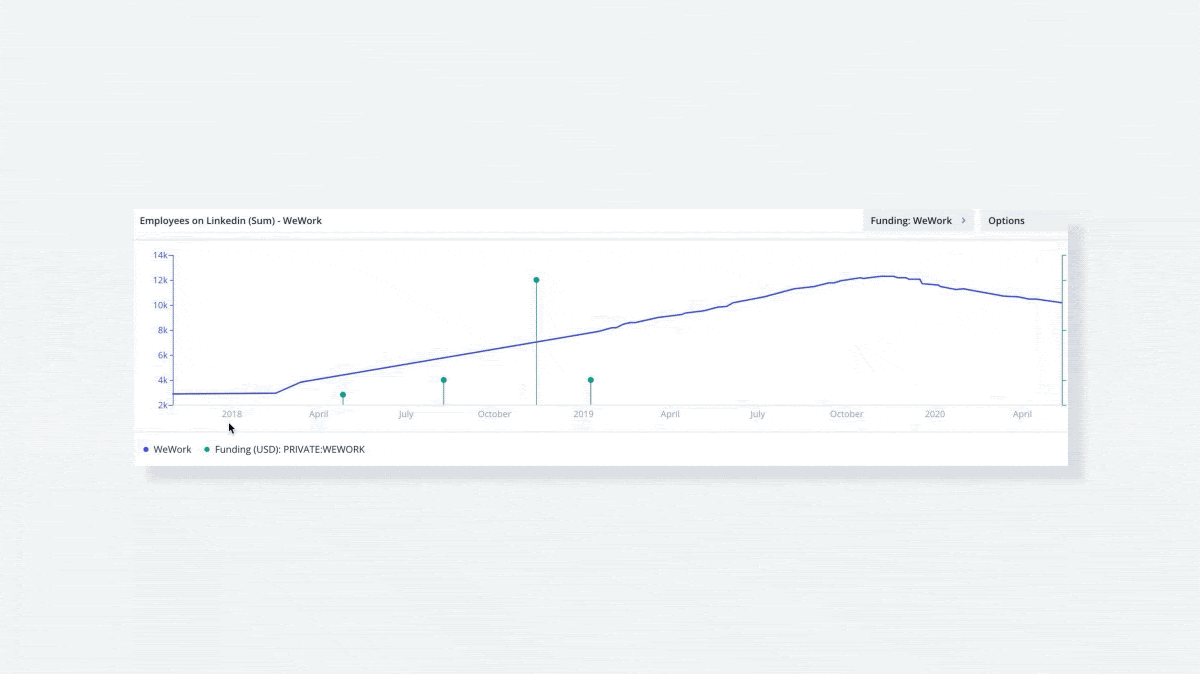 Overlay funding rounds with any of Thinknum’s datasets to analyze the effects of financing on a company. For example, track the changes in WeWork headcount relative to their funding over time.