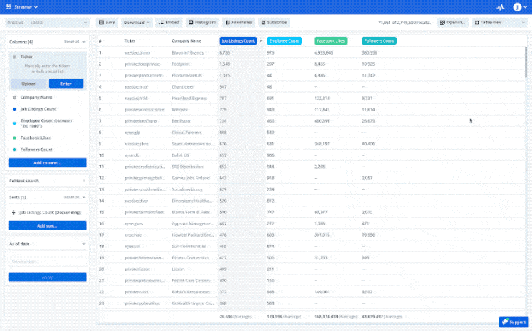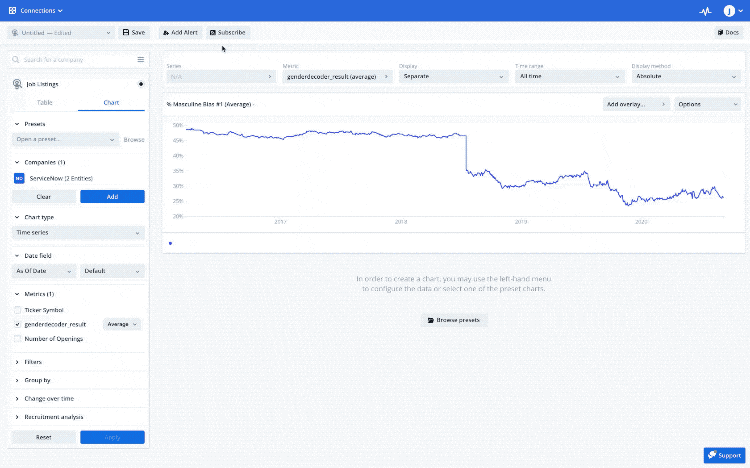 Derive ESG-focused insights for thousands of public and private companies, including the MSCI World Index. Select a company/ticker to screen their job listings for gender-coded words, and determine the % gender bias within each posting. For example, over the past two years ServiceNow has dropped from nearly 50% to below 30% masculine-biased words in their job descriptions.