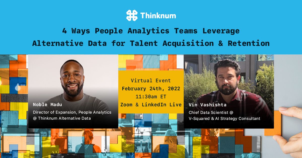 Cool. Sounds great. So when people are pretty familiar right now with the war for talent, that's one of the biggest things I thought about as we prepped this actual webinar. And I kept thinking about something I read, actually, from McKinsey and Company. And McKinsey and Company talks about how people analytics is actually a top priority among 70% of executives across the board, 70%. And executives are really taking people to analytics very seriously. And right now, people have been driving a 25% increase in business productivity, and a 50% decrease in attrition, which definitely helps the bottom line, helps the HR departments and also kind of helps with teams cross functionally to as well. HR departments have very, very much been familiar with internal data and leveraging internal data. I think external data is very new for HR departments. And they haven't really spent a lot of time using external data. So right now, it's a very good time for a lot of companies to kind of tap into a secret weapon, so to speak, which would be external data. And I'm seeing that across the board, I've been talking to a lot of HR leaders from golf with phone with some great fortune 100 people, analytics leaders, too, as well, just earlier today. And we were talking about how HR teams are really using external sources. And that's a high priority for them too, as well. So before we jump into external data, let's talk about what it is. And then we can kind of talk about ways to leverage it. So external data is any type of data that can be captured, processed, and provided outside of your organization, I started your company. And it can come in a variety of ways. company websites, social media, marketplaces, government sources, and external data, something that's outside of your central internal bubble. One of the biggest ways that I've seen leaders leverage external data to drive HR mandates and goals would be within talent acquisition and recruiting actually, and then also in retention. So the number one way would be using a competitive intelligence to drive rapid recruiting. You know, recruiting is really important right now, there is a war for talent literally. And, you know, I didn't choose my words wisely, because of course, you know, we're watching what's going on with the news right now. So hopefully no one has any family and, you know, Ukraine or anywhere in Europe, hopefully they're okay and safe. But there is a there is a battle right now for talent going on. And a lot of people are really trying to figure out ways to attract the right talent and to attract the right talent. quickly too, as well. You know, there's a stat that says that some of the top talent, they're only available on the market for only 10 days, like, people are moving very quickly to hire people. And they're moving very quickly to attract them. And so I'll just say that talent landscape is really important. Companies across the globe right now are engaged in interviewing, retaining, and looking for the best talent and being able to use external sources to do that can be very helpful. So at Thinknum, we actually have a really cool tool, and it's our most popular data set. And our data set is a job listings data set. And so if you're not familiar with Thinknum, we are alternative data lead provider, we track 500,000, plus companies across 35 datasets. So we gather a bunch of external data, and we create a very easy to use dashboard, we also deliver the data through API. And it's a very simple way to be able to kind of see the competitive landscape and understand what's going on, you'd also use the data to look at yourself too, as well. And being able to track companies across those datasets very helpful. It gives you a holistic view, too, as well about some of the strategies. So if for way number one, being able to use talent and competitive intelligence to drive rapid recruiting, you can do that by looking at job listings. That's one of the biggest data sets that can kind of drive that. And we've seen that for a lot of different use cases, actually, specifically, when you're using fresh data sources to understand how the job listings are being boarded, how the job listings are actually being voiced, not just voice in terms of what the title is, but more so where the actual job is located. The actual salary by skill engineers versus salespeople, say for example, one company might be hiring a lot of engineers versus one company might be focusing in on hiring a lot of salespeople and kind of seeing exactly what their strategy will be based on the type of hiring trends. And for example, Apple has a lot of hiring shifts going on right now you can see kind of a different shift between how they're hiring people. And it's really interesting to kind of monitor that as you're trying to create your recruiting strategy. Me as a recruiter, I'm spending time trying to quickly decrease my time to fill decrease my time to hire, figure out ways to be able to get the right person in the right seat quickly. So I can use external data to wine, see what is going on in the marketplace. And how quickly are people filling these roles, first of all, and then looking at these job listings, to see exactly to what type of roles and by location to as well are people hiring for right. So as I can pull this information together, I get a better understanding of the actual job marketplace. And that can allow me to know better. So I can actually move quickly to put myself in a position to attract the talent that I want quicker to drag rapid recruiting. So that's a way that's really important for rapid recruiting, being able to kind of use external data to speed up the recruitment process. So you can know exactly who you're recruiting, hire, recruiting, where you're recruiting them, and and how to actually force that recruiting.