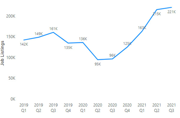 Globally, tech company hiring is higher than it has ever been, with the previous peak being Q3 of 2019, followed by an expected drop as COVID hit. The lowest point was Q2 and Q3 of 2020 with 94663 and 96586 postings, respectively. After which, hiring inc reased each quarter by a CAGR of 31% until 215442 in Q2 2021. In Q3 listings remained at a similar level, increasing slightly to 220850.