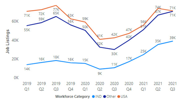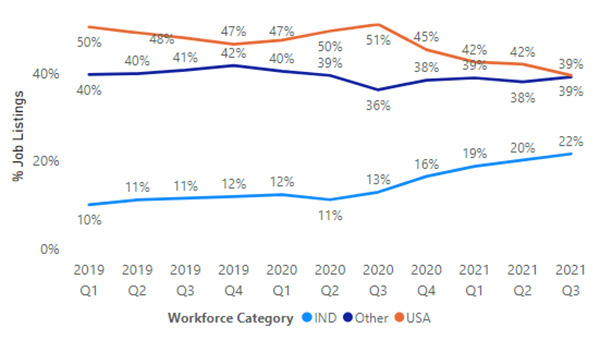 In the United States, this mid 2021 spike is a return to pre-COVID form, as the highest number of listings is actually found in Q3 of 2019, after which job listings were reduced by nearly 50%. Worldwide, excluding the US and India, hiring followed a similar pattern, with a 2019 Q3 peak, followed by a heavy decline and increase to new heights in 2021. India, on the other hand, is seeing a boom in tech job listings more than double anything seen before 2021. Based on the increases in hirings internationally, particularly in India, the actual % of job listings from tech companies based in the United States has decreased from 50% in Q1 2019 to a record low 39% in Q3 2021. India, on the other hand, has increased from 10% to 22% in the same span of time.