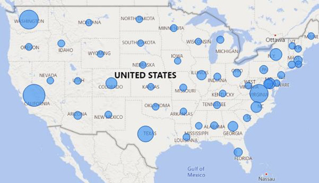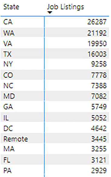 In 2021, the 41 tech companies put up 116966 postings requestin g, 41782 of which were found in the USA, and of which 80% are found in the following 10 states: Washington, California, Virginia, Texas, Colorado, North Carolina, Maryland, New York, Georgia, and Massachusetts.