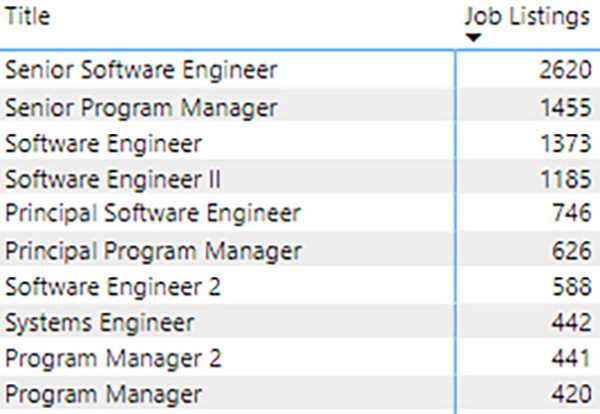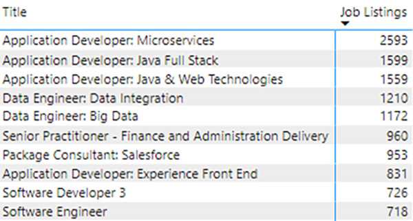 Any of these workforce categories could be broken down into their job families and titles for deeper analysis. As an example of this kind of deep dive, we’ll look at the most prominent job family in listings, Software Developers.
