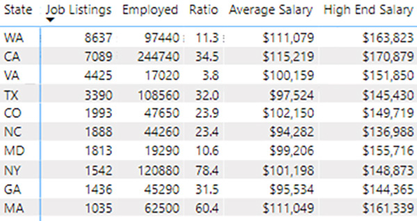Washington State, on the other hand, is a tighter market for software developer talent. The ratio of working software developers to job postings ranks 8th among these 10 states, and the average cost per employee is the 2nd highest.