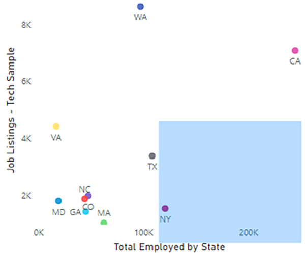 compared to Tech industry demand; the further to the right and lower a state is the more plentiful