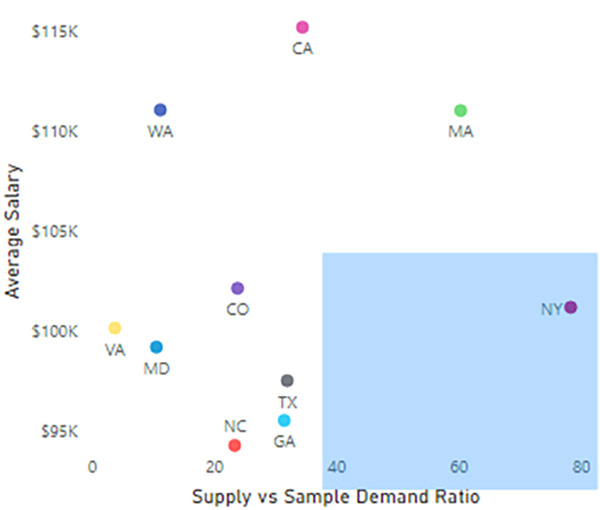 Figure 8 takes this analysis a step further – by comparing the supply demand ratio metric to average salary, we can assess both where supply is more readily available (further to the right) and where average costs are lower (further down). For both charts, the “blue” zone provided is considered the ideal.